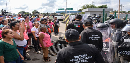 ▲ Ayer por la madrugada, cuando autoridades intentaban llevar a cabo el traslado de dos presos del Centro de Reinserción Social del estado, se produjo un enfrentamiento a balazos con internos que derivó en disturbios en los que también resultaron lesionados cuatro efectivos policiacos. De manera casi simultánea, presuntos criminales quemaron al menos 10 vehículos, una estación de gasolina y seis tiendas de conveniencia en distintos puntos de Villahermosa. Familiares se manifestaron a las puertas del reclusorio (en la imagen) ante la lentitud en el flujo de la información sobre lo sucedido. Foto Afp. René Alberto López, Corresponsal
