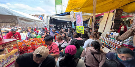 ▲ El comercio ambulante obstruye el tránsito fluido de personas afuera de las estaciones del Metro. En un recorrido de La Jornada en Merced, Pino Suárez, Lagunilla, Zócalo, Tasqueña y Pantitlán se observó que los usuarios esperan unos minutos para subir las escaleras, ya que el espacio se reduce por la presencia de los puestos semifijos.