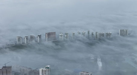 ▲ Los habitantes de Cancún y Playa del Carmen se despertaron ayer en medio de una neblina extraordinaria; este fenómeno es más común en las carreteras de la zona sur del estado y pocas veces ocurre de forma tan intensa en áreas urbanas. La Coordinación de Protección Civil de Quintana Roo solicitó a la población tomar precauciones durante los traslados. Foto Osman Betancourt. La Jornada Maya