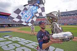 ▲ Eli White, de los Bravos, con el trofeo tras su victoria contra los Rojos en el Clásico de Beisbol de las Grandes Ligas, que registró un récord de asistencia de 91 mil 32 espectadores.