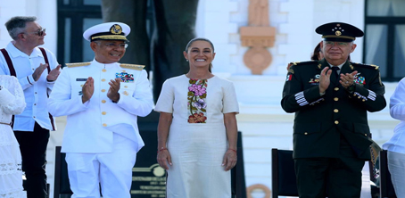 ▲ La presidenta Claudia Sheinbaum encabezó la ceremonia del 204 aniversario de la creación de la Armada de México y 201 años de la promulgación de la primera Constitución federal. También inauguró la Plaza del Heroísmo Veracruzano, ubicada en el malecón, que tiene como propósito honrar la memoria histórica de la ciudad. La flanquean el titular de Marina, Raymundo Pedro Morales, y el de Defensa, Ricardo Trevilla. Se informó que el buque escuela Cuauhtémoc navega de regreso desde Nueva York. Foto Presidencia