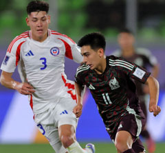 ▲ La selección mexicana clasificó a cuartos de final luego de vencer 4-1 a Chile en Valparaíso, con tantos de Tahiel Jiménez, Iker Fimbres y doblete de Hugo Camberos. La figura del equipo, Gilberto Mora (en un desborde aquí), volvió a tener un juego destacado y salió de cambio en el segundo tiempo. Foto Afp / Redacción